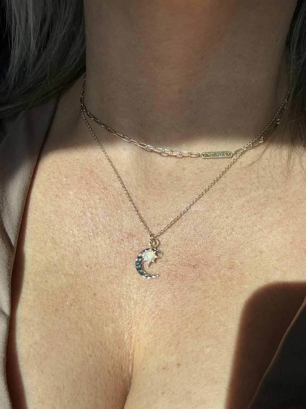 - Moon Detail: Textured hammered moon pendant adds contrast, depth, and artisanal charm